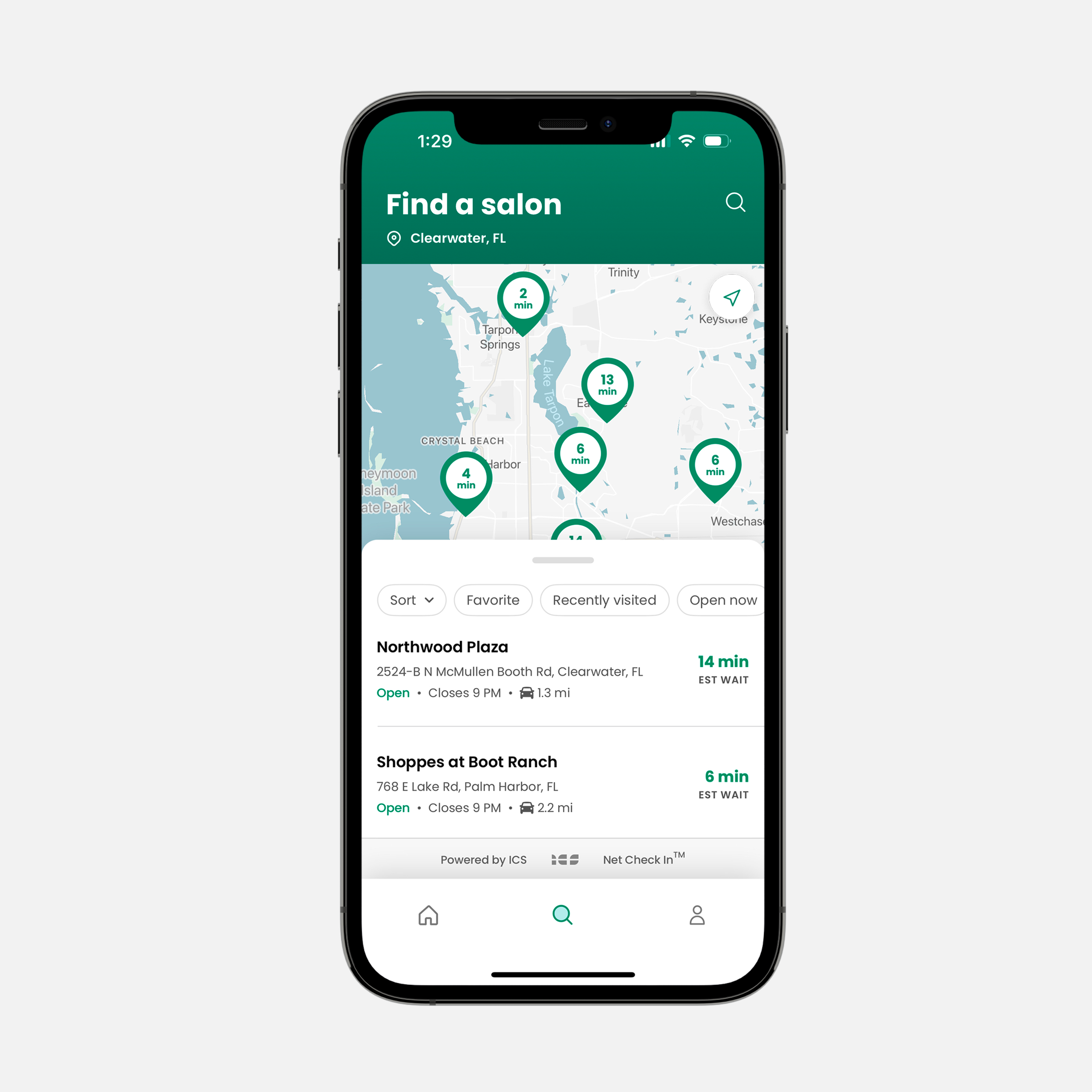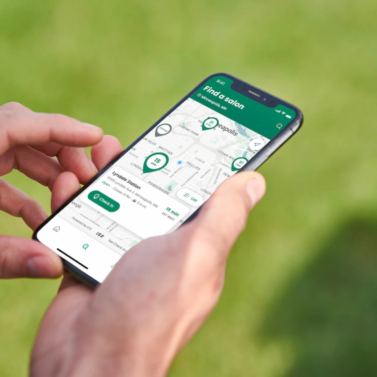 2. If you have location services enabled, you’ll see a map with salons in your area and their wait times. Click on the salon location you prefer.